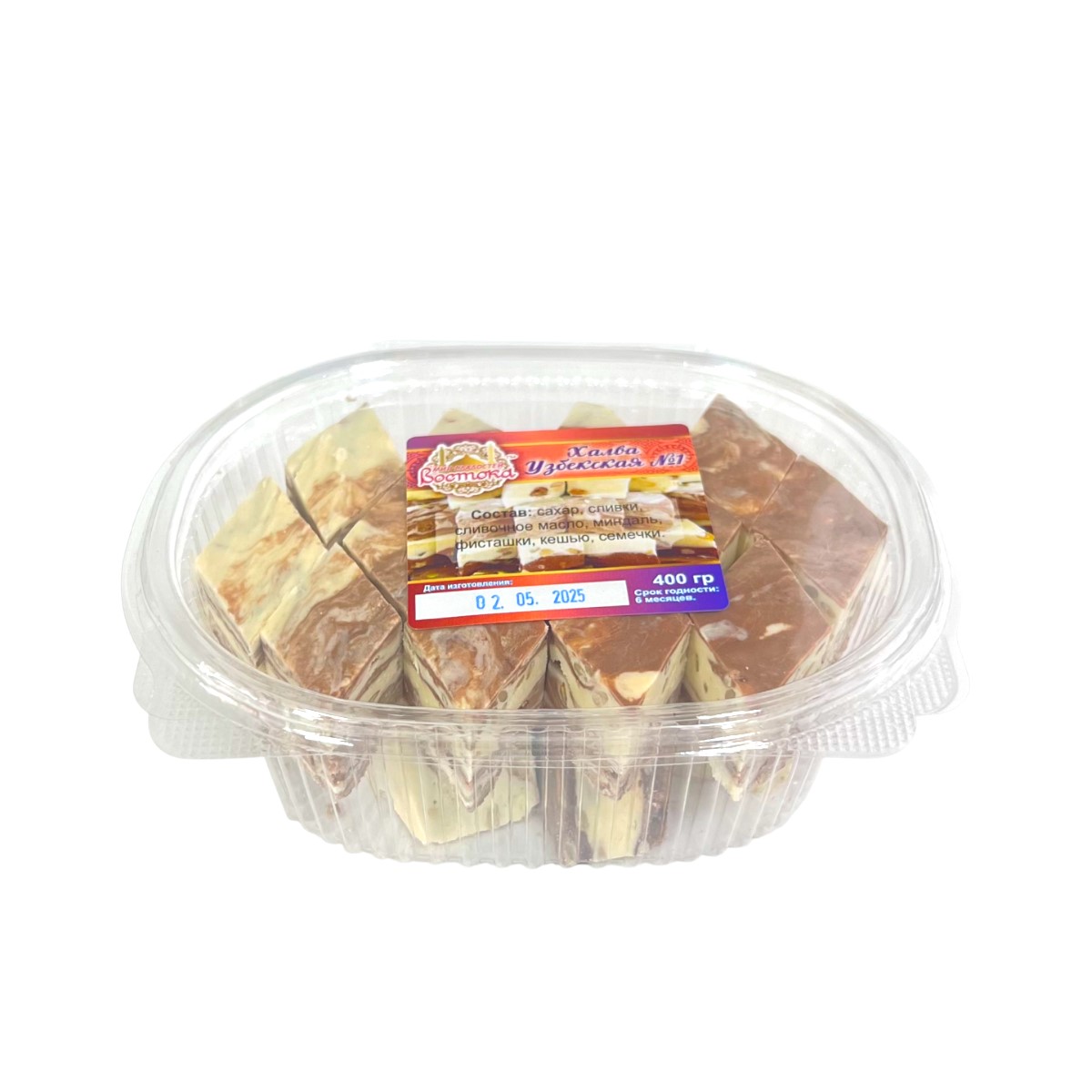 Халва Узбекистанская — ароматное и нежное восточное лакомство, приготовленное по традиционным рецептам. Богатый вкус натуральной халвы гармонично сочетается с нежными нотками молочного или белого молочного шоколада. Идеальный десерт для ценителей сладкого, отлично подойдет для семейного чаепития или в качестве оригинального подарка.