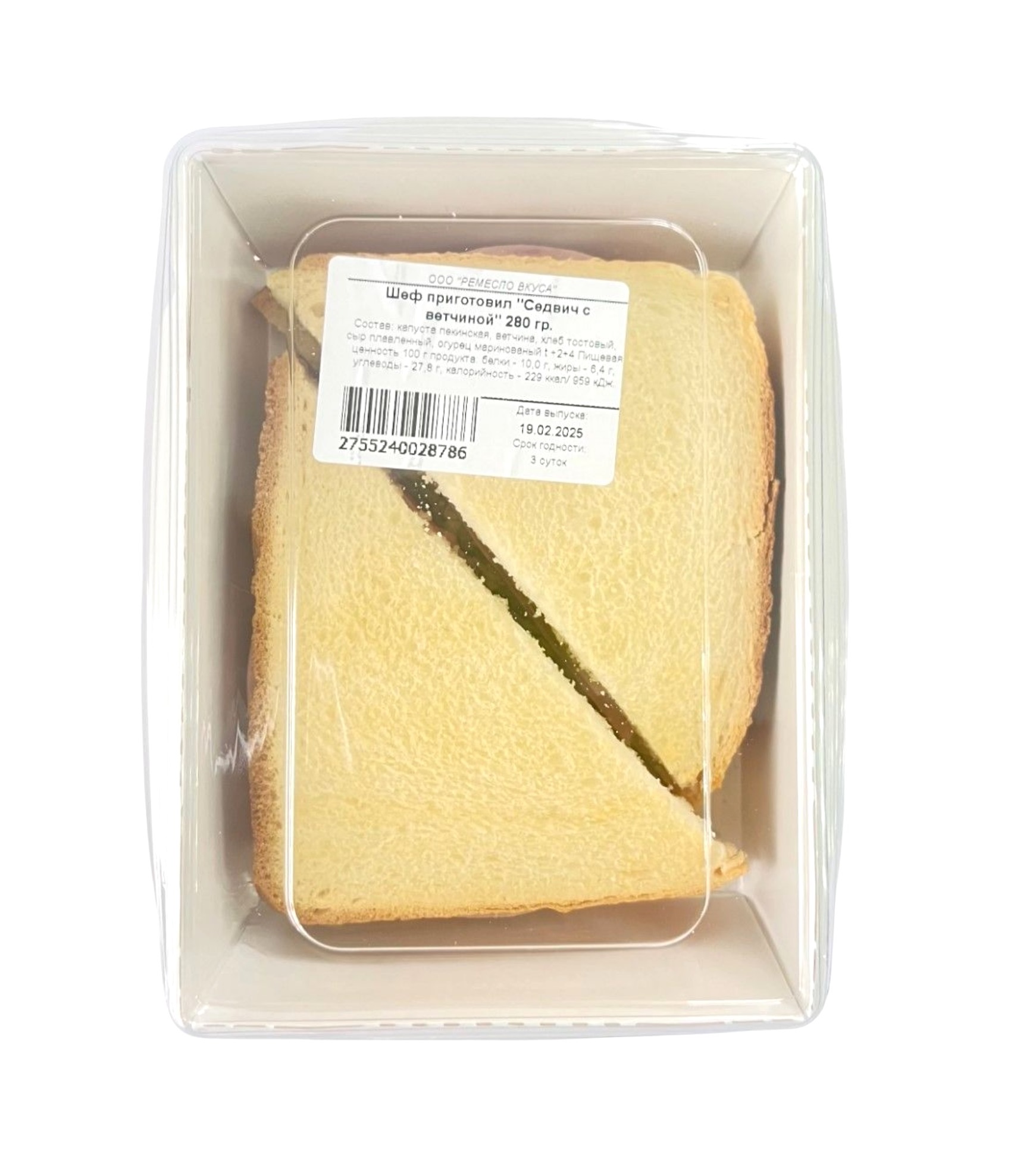 Капуста пекинская, ветчина, хлеб тостовый, сыр плавленный, огурец маринованый. Условия хранения: t +2+4. Пищевая ценность 100 г продукта: белки - 10,0 г, жиры - 6,4 г, углеводы - 27,8 г, калорийность - 229 ккал/ 959 кДж.